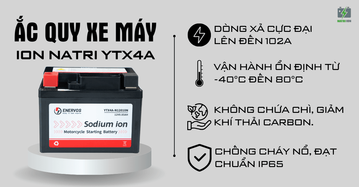 Ưu điểm nổi bật của YTX4A là trọng lượng siêu nhẹ (chỉ bằng 1/3 ắc quy chì), tuổi thọ vượt trội trên 30.000 lần khởi động, vận hành ổn định trong dải nhiệt độ rộng từ -40°C đến 80°C. Đồng thời, bình ắc quy natri ion xe máy YTX4A có tỷ lệ tự xả cực thấp <2%/tháng, đạt chuẩn bảo vệ IP65, chống cháy nổ, chống rung và thân thiện môi trường.